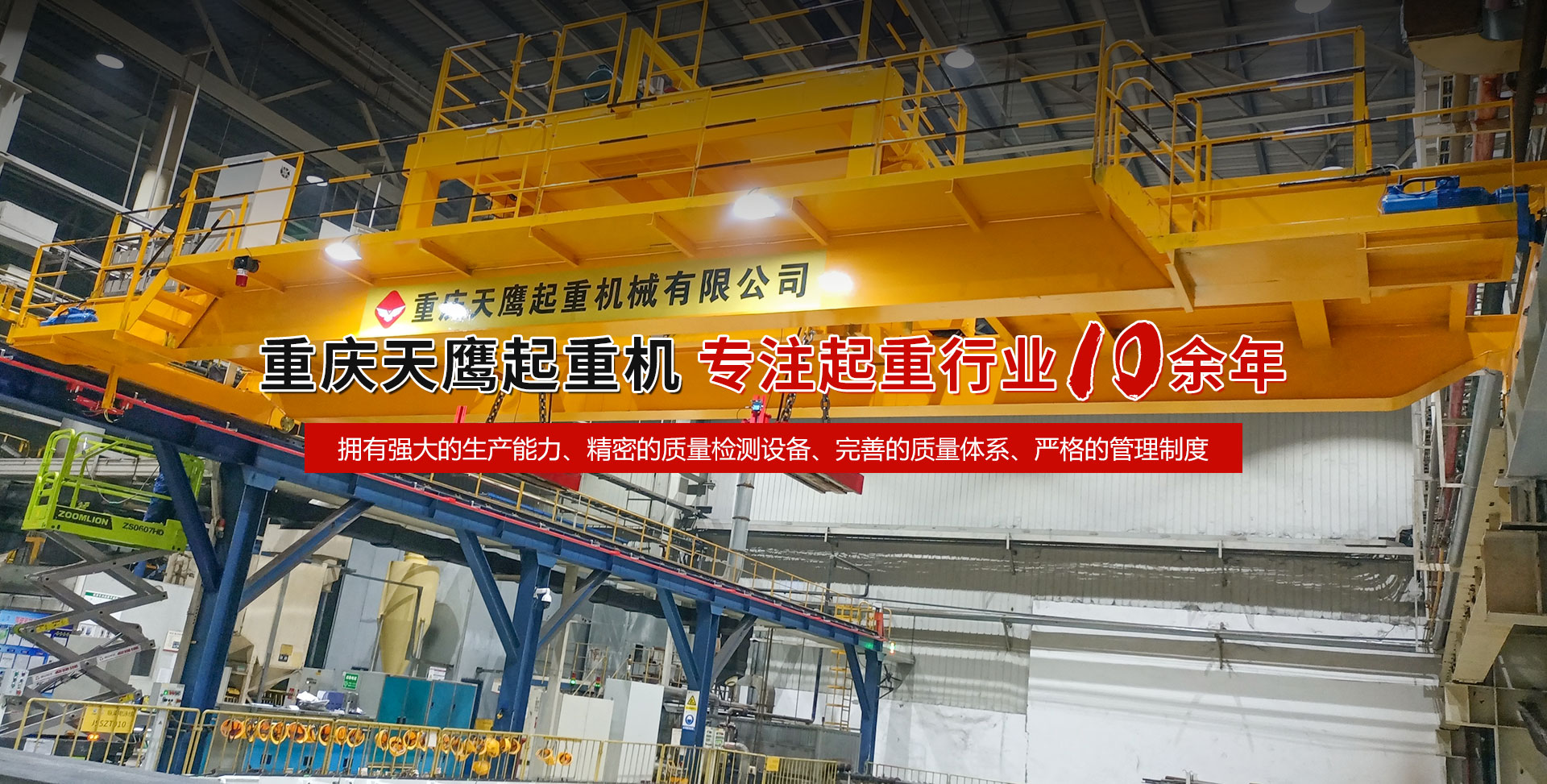 重慶天鷹起重機(jī)械有限公司成立于2014年,主營(yíng)起重機(jī)的銷(xiāo)售、安裝和維護(hù)等相關(guān)服務(wù)。中國(guó)重型機(jī)械工業(yè)協(xié)會(huì)員單位、為中國(guó)工程機(jī)械工業(yè)協(xié)會(huì)工程機(jī)械維修分會(huì)會(huì)員單位及西南地區(qū)起重機(jī)械定點(diǎn)安裝維修單位。具有國(guó)家質(zhì)量監(jiān)督檢疫總局頒發(fā)的特種設(shè)備安裝維修改造質(zhì)格證書(shū)。并率先通過(guò)了IS09001-2000質(zhì)量體系認(rèn)證?! 」咀?cè)資金3000萬(wàn)元;廠(chǎng)房面積2萬(wàn)平方米;各種生產(chǎn)檢測(cè)設(shè)備50臺(tái)套,公司技術(shù)力量雄厚,聘請(qǐng)了國(guó)內(nèi)知名起重機(jī)專(zhuān)家、工程技術(shù)人員擔(dān)當(dāng)項(xiàng)目經(jīng)理、技術(shù)總工程師及顧問(wèn)。現(xiàn)擁有員工100多人,其中工程技術(shù)人員12人?! ≈鲗?dǎo)產(chǎn)品為各類(lèi)橋、門(mén)式起重機(jī)及輕小型起重設(shè)備,具備生產(chǎn)起重量200t及以下通用橋、門(mén)式起重機(jī)的能力,尤其在200t以下起重機(jī)產(chǎn)品上具備較強(qiáng)的市場(chǎng)競(jìng)爭(zhēng)力,為許多行業(yè)設(shè)計(jì)制造了技術(shù)含量高、技術(shù)性強(qiáng)的起重設(shè)備,許多產(chǎn)品在原設(shè)計(jì)標(biāo)準(zhǔn)上進(jìn)行了較大的改進(jìn)、優(yōu)化和創(chuàng)新;其中NH型系列電動(dòng)葫蘆、HD型電動(dòng)單梁處于國(guó)內(nèi)高水平.....  好的產(chǎn)品品質(zhì)需要由較高的裝備水平來(lái)保證,公司購(gòu)買(mǎi)了“大型數(shù)控落地鏜”、“數(shù)控切割機(jī)床”、“自調(diào)式焊接滾輪機(jī)”、“數(shù)顯液壓板料折彎?rùn)C(jī)”、“超大型數(shù)控臥式車(chē)床”、“數(shù)控液壓水平下調(diào)式三輥卷板機(jī)”、“單柱移動(dòng)式立式車(chē)床”“擁有用于單梁生產(chǎn)的全國(guó)一條拋丸噴漆烘干線(xiàn)、葫蘆噴漆烘干線(xiàn)和全國(guó)較大的100T葫蘆試驗(yàn)臺(tái)和檢測(cè)中心”等各種先進(jìn)的加工設(shè)備,新建廠(chǎng)房面積近2萬(wàn)平方米?! ≠|(zhì)量是企業(yè)的生命,天鷹公司依據(jù)“ISO 9001國(guó)際質(zhì)量管理體系”標(biāo)準(zhǔn),制定并完善了公司的質(zhì)量管理體制。堅(jiān)持質(zhì)量體系的內(nèi)審和外審,將質(zhì)量管理工作落實(shí)到企業(yè)生產(chǎn)經(jīng)營(yíng)的全過(guò)程?! ∧奈⑿Γ翘禚椨篮愕淖非?;天鷹的服務(wù),是您首要的選擇!因?yàn)槲覀儓?jiān)信:“誠(chéng)信是本、質(zhì)量鑄就品牌”。為您服務(wù)是我們的榮耀,勤奮而進(jìn)取的天鷹人,時(shí)刻期盼著您的到來(lái)。